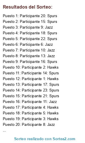 Lista de participantes: Participante 1: Hawks, Participante 2: Hawks, Participante 3: Hawks, Participante 4: Hawks, Participante 5: Hawks, Participante 6: Jazz, Participante 7: Jazz, Participante 8: Jazz, Participante 9: Jazz, Participante 10: Jazz, Participante 11: Jazz, Participante 12: Jazz, Participante 13: Jazz, Participante 14: Spurs, Participante 15: Spurs, Participante 16: Spurs, Participante 17: Spurs, Participante 18: Spurs, Participante 19: Spurs, Participante 20: Spurs, Participante 21: Spurs, Participante 22: Spurs, Participante 23: Spurs.