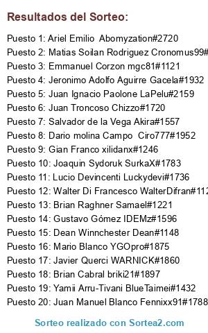 Lista de participantes: Emmanuel Corzon mgc81#1121, Ariel Emilio Abomyzation#2720, Javier Querci WARNICK#1860, Joaquin Sydoruk SurkaX#1783, Salvador de la Vega Akira#1557, Juan Ignacio Paolone LaPelu#2159, Lucio Devincenti Luckydevi#1736, Jeronimo Adolfo Aguirre Gacela#1932, Juan Manuel Blanco Fennixx91#1788, Matias Soilan Rodriguez Cronomus99#2484, Yamii Arru-Tivani BlueTaimei#1432, Brian Cabral briki21#1897, Walter Di Francesco WalterDifran#1125, Dean Winnchester Dean#1148, Gustavo Gómez IDEMz#1596, Gian Franco xilidanx#1246, Brian Raghner Samael#1221, Juan Troncoso Chizzo#1720, Mario Blanco YGOpro#1875, Dario molina Campo Ciro777#1952.