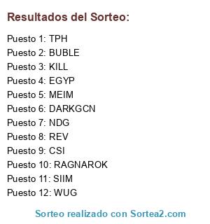 Lista de participantes: BUBLE, DARKGCN, SIIM, REV, CSI, RAGNAROK, EGYP, KILL, NDG, WUG, TPH, MEIM.