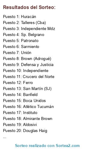 Lista de participantes: Aldosivi, Almirante Brown, Atlético Tucumán, Banfield, Boca Unidos, Brown (Adrogué), Crucero del Norte, Defensa y Justicia, Douglas Haig, Ferro, Gimnasia (J), Huracán, Independiente, Independiente Mdz, Instituto, Patronato, San Martín (SJ), Sarmiento, Sp. Belgrano, Talleres (Cba), Unión, Villa San Carlos.