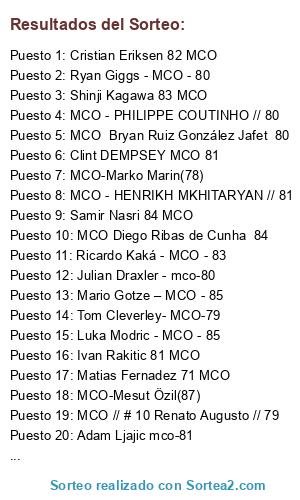 Lista de participantes: Adam Ljajic mco-81 , Julian Draxler - mco-80, Oscar dos Santos - MCO - 82, Ryan Giggs - MCO - 80, MCO - David Silva - 88, MCO - PHILIPPE COUTINHO // 80, MCO - HENRIKH MKHITARYAN // 81, Mario Gotze – MCO - 85, MCO // Wesley Sneijder // 84, Shinji Kagawa 83 MCO, MCO Marco Reus 85, MCO Mario Götze 85, Luka Modric - MCO - 85, MCO-Mesut Özil(87), MCO-Marko Marin(78) , Samir Nasri 84 MCO, Ivan Rakitic 81 MCO, Cristian Eriksen 82 MCO, MCO Bryan Ruiz González Jafet 80, MCO Diego Ribas de Cunha 84 , MCO // # 10 Renato Augusto // 79, Clint DEMPSEY MCO 81, Matias Fernadez 71 MCO , A Hernandes hernanes83 (MCO), Ricardo Kaká - MCO - 83 , Tom Cleverley- MCO-79, MCO - Francisco Alarcon Isco 84, MCO // # - Kevin De Bruyne // 81.
