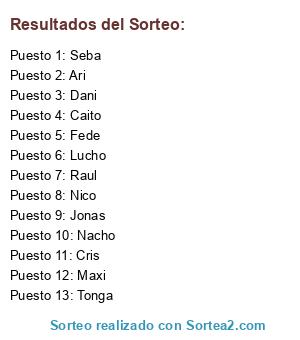 Lista de participantes: Fede, Nacho, Lucho, Tonga, Dani, Maxi, Seba, Nico, Jonas, Cris, Caito, Ari, Raul.