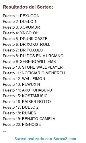 Lista de participantes: PEXUGON, PEWUXIN, MR X, YA GO OH, DRUNK CASTE, BENJITO CAMELA, DUELO 1, DR XOKOTROLL, NOTICIARIO MENERELL, XOKOMUR, KANOUTE, DR POXOLO, NHN FOREVER, PIGNOISE, SERENO WILLIEMS, KOSTAMUSIC, AKU TUHABURU, SEMURAIN BOLT, DUELO 2, STONE WALL PLAYER, 13TIMADOR, PERFIL BUENO DE WAYAT, KAISER ROTTO, WALLEIMON, PIEZOD LUEGO EXISTO, RUMES, VOLIM TE, RUIDOS EN MURCIANO, WILLIE DICKPIC, AKU PANUMBANG KAYU, RODRIGO DIAZ DE BIRRAS, SPIDEY GONZALEZ.