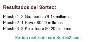 Lista de participantes: 1-Rever 80 20 millones, 2-Gamberini 79 18 millones, 3-Kolo Toure 80 20 millones.