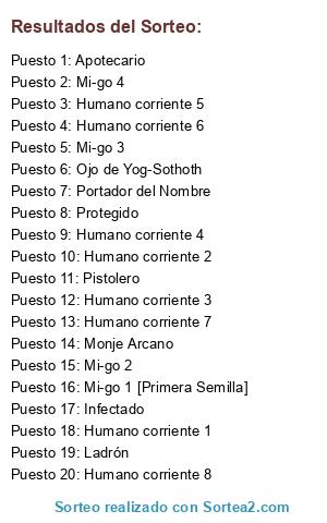 Lista de participantes: Humano corriente 1, Humano corriente 2, Humano corriente 3, Humano corriente 4, Humano corriente 5, Humano corriente 6, Humano corriente 7, Humano corriente 8, Humano corriente 9, Mi-go 1 [Primera Semilla], Mi-go 2, Mi-go 3, Mi-go 4, Ojo de Yog-Sothoth, Portador del Nombre, Apotecario, Monje Arcano, Pistolero, Ladrón, Hipnotizador, Infectado, Protegido.