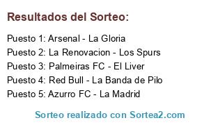 Lista de participantes: Azurro FC - La Madrid, Red Bull - La Banda de Pilo, Palmeiras FC - El Liver, La Renovacion - Los Spurs, Arsenal - La Gloria.