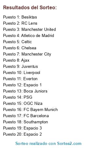 Lista de participantes: Ajax, Atletico de Madrid, Besiktas, Boca Juniors, Celtic, Chelsea, Everton, FC Barcelona, FC Bayern Munich, Juventus, Liverpool, Manchester City, Manchester United, OGC Niza, PSG, RC Lens, Southampton, Espacio 1, Espacio 2, Espacio 3.