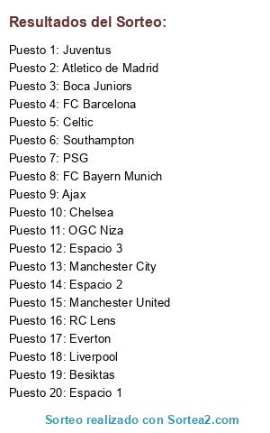 Lista de participantes: Ajax, Atletico de Madrid, Besiktas, Boca Juniors, Celtic, Chelsea, Everton, FC Barcelona, FC Bayern Munich, Juventus, Liverpool, Manchester City, Manchester United, OGC Niza, PSG, RC Lens, Southampton, Espacio 1, Espacio 2, Espacio 3.