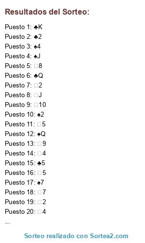 Lista de participantes: ♠2, ♠3, ♠4, ♠5, ♠6, ♠7, ♠8, ♠J, ♠Q, ♠K, ♡2, ♡3, ♡4, ♡5, ♡6, ♡7, ♡8, ♡9, ♡10, ♡K, ♣2, ♣3, ♣5, ♣6, ♣7, ♣8, ♣10, ♣Q, ♣K, ♣A, ♢2, ♢4, ♢5, ♢6, ♢7, ♢8, ♢J, ♢Q, ♢K, ♢A.