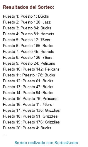 Lista de participantes: Puesto 1: Bucks, Puesto 2: Bucks, Puesto 3: 76ers, Puesto 4: Bucks, Puesto 5: 76ers, Puesto 6: 76ers, Puesto 7: 76ers, Puesto 8: 76ers, Puesto 9: Hornets, Puesto 10: Pelicans, Puesto 11: 76ers, Puesto 12: 76ers, Puesto 13: 76ers, Puesto 14: Hornets, Puesto 15: Jazz, Puesto 16: Hornets, Puesto 17: Hornets, Puesto 18: Grizzlies, Puesto 19: Jazz, Puesto 20: Hornets, Puesto 21: Grizzlies, Puesto 22: Pelicans, Puesto 23: 76ers, Puesto 24: Pelicans, Puesto 25: 76ers, Puesto 26: Hornets, Puesto 27: Pelicans, Puesto 28: Grizzlies, Puesto 29: 76ers, Puesto 30: 76ers, Puesto 31: Hornets, Puesto 32: Bucks, Puesto 33: 76ers, Puesto 34: Hornets, Puesto 35: Pelicans, Puesto 36: Pelicans, Puesto 37: Bucks, Puesto 38: Grizzlies, Puesto 39: Pelicans, Puesto 40: 76ers, Puesto 41: 76ers, Puesto 42: 76ers, Puesto 43: Jazz, Puesto 44: 76ers, Puesto 45: Hornets, Puesto 46: Hornets, Puesto 47: Bucks, Puesto 48: Grizzlies, Puesto 49: 76ers, Puesto 50: Grizzlies, Puesto 51: Jazz, Puesto 52: 76ers, Puesto 53: Bucks, Puesto 54: 76ers, Puesto 55: 76ers, Puesto 56: Jazz, Puesto 57: Pelicans, Puesto 58: 76ers, Puesto 59: Bucks, Puesto 60: Hornets, Puesto 61: Bucks, Puesto 62: Grizzlies, Puesto 63: Bucks, Puesto 64: Hornets, Puesto 65: 76ers, Puesto 66: Jazz, Puesto 67: Grizzlies, Puesto 68: Pelicans, Puesto 69: 76ers, Puesto 70: Grizzlies, Puesto 71: Pelicans, Puesto 72: Jazz, Puesto 73: Bucks, Puesto 74: Pelicans, Puesto 75: Pelicans, Puesto 76: Pelicans, Puesto 77: Hornets, Puesto 78: 76ers, Puesto 79: Pelicans, Puesto 80: Hornets, Puesto 81: Hornets, Puesto 82: Pelicans, Puesto 83: Hornets, Puesto 84: Bucks, Puesto 85: 76ers, Puesto 86: 76ers, Puesto 87: Grizzlies, Puesto 88: Grizzlies, Puesto 89: Hornets, Puesto 90: Grizzlies, Puesto 91: Grizzlies, Puesto 92: Grizzlies, Puesto 93: Hornets, Puesto 94: Bucks, Puesto 95: Pelicans, Puesto 96: Pelicans, Puesto 97: Grizzlies, Puesto 98: 76ers, Puesto 99: Bucks, Puesto 100: Pelicans, Puesto 101: Grizzlies, Puesto 102: Hornets, Puesto 103: Hornets, Puesto 104: Pelicans, Puesto 105: Jazz, Puesto 106: Pelicans, Puesto 107: Hornets, Puesto 108: 76ers, Puesto 109: 76ers, Puesto 110: Bucks, Puesto 111: Grizzlies, Puesto 112: Pelicans, Puesto 113: Hornets, Puesto 114: Grizzlies, Puesto 115: Grizzlies, Puesto 116: Jazz, Puesto 117: Pelicans, Puesto 118: Hornets, Puesto 119: Pelicans, Puesto 120: Jazz, Puesto 121: 76ers, Puesto 122: 76ers, Puesto 123: 76ers, Puesto 124: Hornets, Puesto 125: Hornets, Puesto 126: 76ers, Puesto 127: Jazz, Puesto 128: Bucks, Puesto 129: Grizzlies, Puesto 130: 76ers, Puesto 131: 76ers, Puesto 132: Pelicans, Puesto 133: Bucks, Puesto 134: Jazz, Puesto 135: Bucks, Puesto 136: Grizzlies, Puesto 137: Pelicans, Puesto 138: Pelicans, Puesto 139: Grizzlies, Puesto 140: Hornets, Puesto 141: Pelicans, Puesto 142: Pelicans, Puesto 143: Grizzlies, Puesto 144: 76ers, Puesto 145: 76ers, Puesto 146: Hornets, Puesto 147: Grizzlies, Puesto 148: Hornets, Puesto 149: Grizzlies, Puesto 150: 76ers, Puesto 151: Grizzlies, Puesto 152: Pelicans, Puesto 153: 76ers, Puesto 154: Hornets, Puesto 155: Hornets, Puesto 156: Bucks, Puesto 157: Pelicans, Puesto 158: 76ers, Puesto 159: 76ers, Puesto 160: Bucks, Puesto 161: Hornets, Puesto 162: Hornets, Puesto 163: Hornets, Puesto 164: Hornets, Puesto 165: Bucks, Puesto 166: Hornets, Puesto 167: Pelicans, Puesto 168: Bucks, Puesto 169: Pelicans, Puesto 170: Hornets, Puesto 171: Pelicans, Puesto 172: Pelicans, Puesto 173: Hornets, Puesto 174: Hornets, Puesto 175: Hornets, Puesto 176: Grizzlies, Puesto 177: Grizzlies, Puesto 178: Bucks, Puesto 179: 76ers, Puesto 180: 76ers, Puesto 181: Pelicans, Puesto 182: Hornets, Puesto 183: Jazz, Puesto 184: Jazz.