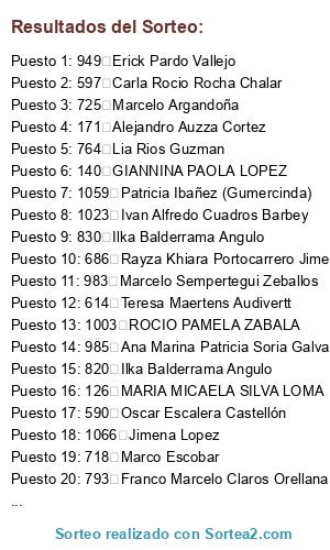 Lista de participantes: 1 Diana Vargas, 2 Diana Vargas, 3 Diana Vargas, 4 Jose Miguel Gandarillas, 5 Jose Miguel Gandarillas, 6 Jose Miguel Gandarillas, 7 Veronica Condarco, 8 Alejandro Sejas, 9 Alejandro Sejas, 10 Natalia Revollo, 11 Natalia Herbas, 12 Natalia Herbas, 13 Sergio Claros, 14 Sergio Claros, 15 Sergio Claros, 16 Sergio Claros, 17 Sergio Claros, 18 Maria Fernanda Rojas Neri, 19 Maria Fernanda Rojas Neri, 20 María Fernanda Carolina Rojas Calustro, 21 Liz Vega, 22 Alexander Solares Palacios, 23 Marco Gamboa, 24 Marco Gamboa, 25 Marco Gamboa, 26 Diego Guzman Nagel, 27 Diego Guzman Nagel, 28 Andrea Vargas Villegas, 29 Andrea Vargas Villegas, 30 Andrea Vargas Villegas, 31 Monica Triguero Mamani, 32 Albert Ortega, 33 Albert Ortega, 34 Jhoselyn Yanapatzi Gutierrez, 35 Daniela Rivero Villaroel, 36 Eduardo Villaroel Vargas, 37 Lucia Viscarra, 38 Rodrigo Ergueta, 39 Giselle Quiroga, 40 Giselle Quiroga, 41 Giselle Quiroga, 42 Giselle Quiroga, 43 Daniel Luis Castillo Palacios, 44 Daniel Luis Castillo Palacios, 45 Jose Manuel Carreon Ruiz, 46 Jose Manuel Carreon Ruiz, 47 Karla Claure Ortiz, 48 Karla Claure Ortiz, 49 Karla Claure Ortiz, 50 Karla Claure Ortiz, 51 Karla Claure Ortiz, 52 Karla Claure Ortiz, 53 Karla Claure Ortiz, 54 Karla Claure Ortiz, 55 Karla Claure Ortiz, 56 Veronica Condarco, 57 Karla Claure Ortiz, 58 Claudia Peñaloza, 59 Rosario Conde, 60 Rosario Conde, 61 Rosario Conde, 62 Stefania Vargas, 63 Stefania Vargas, 64 Stefania Vargas, 65 Stefania Vargas, 66 Evelyn Bermudez, 67 Evelyn Bermudez, 68 Evelyn Bermudez, 69 Sofia Cabezas, 70 Sofia Cabezas, 71 Sofia Cabezas, 72 Sofia Cabezas, 73 Sofia Cabezas, 74 Sofia Cabezas, 75 Sofia Cabezas, 76 Sofia Cabezas, 77 Sofia Cabezas, 78 Sofia Cabezas, 79 Juan Pablo Taya, 80 Juan Pablo Taya, 81 Claudia Navarro, 82 Claudia Navarro, 83 Monica Campero, 84 Silvia Guzman, 85 Maria Claudia Gutierrez, 86 Maria Claudia Gutierrez, 87 Maria Claudia Gutierrez, 88 Maria Claudia Gutierrez, 89 Yolanda Carvajal, 90 Yolanda Carvajal, 91 Rosario Carvajal, 92 Paola Zamuriano, 93 Alejandro Auzza Cortez, 94 Lenny Dayana Miranda Muñoz, 95 Nicole Revollo, 96 Nicole Revollo, 97 Luzana Condarco, 98 Alejandro Auzza Cortez, 99 Freddy Rodriguez, 100 Alejandro Auzza Cortez, 101 Fabiola Andrew, 102 Fabiola Andrew, 103 Fabiola Andrew, 104 Fabiola Andrew, 105 Fabiola Andrew, 106 Fabiola Andrew, 107 Alejandro Auzza Cortez, 108 Luzana Condarco, 109 Lilian Villegas, 110 Luis Rodriguez Aguilera, 111 Norah Guerrero Pereira, 112 LAURA ROJAS TRIGO, 113 CAROLINA ISABEL PAZ MORALES, 114 CAROLINA ISABEL PAZ MORALES, 115 ALEXIS SANTA CRUZ CRESPO, 116 IVAN CESPEDES M., 117 IVAN CESPEDES M., 118 IVAN CESPEDES M., 119 IVAN CESPEDES M., 120 IVAN CESPEDES M., 121 ELIANA MAJLUF BASS WERNER, 122 Alejandro Auzza Cortez, 123 CAROLA ANDREA VALLEJO CLAURE, 124 MARIA MICAELA SILVA LOMA, 125 MARIA MICAELA SILVA LOMA, 126 MARIA MICAELA SILVA LOMA, 127 JOSE MARIO VALDIVIA GAMBOA, 128 PAOLA VIDAL ALVAREZ, 129 PAOLA VIDAL ALVAREZ, 130 Veronica Condarco, 131 MABEL ADUVIRI OCHOA, 132 KARINA CAMACHO RAMIREZ, 133 KARINA CAMACHO RAMIREZ, 134 JOSE BISMAR CANELAS REVOLLO, 135 JOSE BISMAR CANELAS REVOLLO, 136 Alejandro Auzza Cortez, 137 MARIANA GONZALES, 138 Osbaldo Navia, 139 MARCELO MENDOZA CABALLERO, 140 GIANNINA PAOLA LOPEZ, 142 Henry García, 144 Alejandro Auzza Cortez, 145 Luz Garnica, 150 Jhosep Carmona Garcia, 155 Alejandro Auzza Cortez, 160 Henry García, 169 Alejandro Auzza Cortez, 171 Alejandro Auzza Cortez, 173 Mario Emanuel Amaya Velasco, 182 Alejandro Auzza Cortez, 200 Veronica Condarco, 201 Claudia Zabala, 216 Min Bo Zhong, 218 Alejandro Ruslan Arnez Vargas, 220 Brandon Santander, 226 Leonardo Cristhian Gonzales Vargas, 237 Carlos Alberto Toro Sarmiento, 250 Ronald Morales, 251 Williams Denis Vasquez Flores, 254 Alvaro Camacho Bermudes, 265 Valeria Fabiana Toro Vargas, 270 Ronald Morales, 277 Veronica Moreno, 283 Enrique Daniel Antezana Vargas, 286 Vanessa Fernanda Toro Vargas, 288 Ivan Rodrigo Saravia, 307 Jhonny Quiroga, 315 Ronald Morales, 318 Sandra Vargas, 322 Melina Ocampo, 326 Ronald Morales, 327 Ronald Morales, 333 Sanny Anghela Lizarro Quiroga, 337 Luis Richard Marquina Lopez, 342 Alvaro Camacho Bermudes, 351 Vanessa Fernanda Toro Vargas, 365 Cristelh Laiz Miranda Suarez, 367 Benjamin Claudio Quiroga Rocabado, 377 Sandra Vargas, 382 Stephany Soto Zurita, 393 Vanessa Fernanda Toro Vargas, 395 Claudia Zabala, 402 Rene Morales Campero, 406 Adriana Stephanie Perez Claros, 407 Ingrid Verónica Chalar Barrenechea, 409 Limberth Felix Chalar Barrenechea, 410 Mario Chalar Iporre, 412 Arianne Hinojosa Jimenez, 417 María Antonieta Rocha Terrazas, 420 Rodrigo Bilbao La Vieja, 439 Salma Florencia Uriarte Jiménez, 444 Ignacio Velez Ocampo Justiniano, 450 Rocio Verónica Chalar Barrenechea, 454 Carmen Pucllas Ayala, 460 Arianne Hinojosa Jimenez, 466 Mariela Covarrubias Arevalo, 469 Limberth Felix Chalar Barrenechea, 474 Gustavo Guaman Argandoña, 476 Fabiana Gabriela Maldonado Rospillosa, 477 Yeguel Reynolds, 487 Victor Gutierrez Dalence, 490 Oscar Escalera Castellón, 491 Luis De La Zerda Agreda, 496 Melany Patiño Hidalgo, 500 Andrea Cecilia Rocha Chalar, 504 Carlos Alejandro Rocha Chalar, 507 Teresa Barrenechea Valdez, 512 Melida P. de La Fuente, 513 Gustavo Guaman Argandoña, 515 Yeguel Reynolds, 517 Melida P. de La Fuente, 518 Salma Florencia Uriarte Jiménez, 521 Carolina Padilla, 522 Gustavo Paz Antezana, 525 Carlos Rafael Rocha Terrazas, 530 Jose Maria Ayala Martinez, 531 Jose Maria Ayala Martinez, 555 Marcelo Mario Chalar Barrenechea, 569 Daniela Rocha Villegas, 571 Rodrigo Bilbao La Vieja, 577 María Antonieta Rocha Terrazas, 590 Oscar Escalera Castellón, 595 Paola Andrea Fernzandez Villabla, 596 Paola Andrea Fernzandez Villabla, 597 Carla Rocio Rocha Chalar, 598 Rina Candy Delgadillo Carrasco, 599 Gustavo Paz Antezana, 600 Ignacio Velez Ocampo Justiniano, 601 Rene Morales Campero, 602 Cecilia Ibañez Maertens, 603 Gustavo Paz Antezana, 604 Andrea Maldonado Villegas, 605 Andrea M