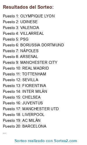 Lista de participantes: BARCELONA, UDINESE, MANCHESTER CITY, ARSENAL, BORUSSIA DORTMUND, NÁPOLES, MANCHESTER UTD, REAL MADRID, ATLÉTICO MADRID, CHELSEA, VALENCIA, TOTTENHAM, FIORENTINA, LIVERPOOL, BAYER MUNICH, AC MILÁN, PSG, INTER MILÁN, JUVENTUS, OLYMPIQUE LYON, SEVILLA, AS ROMA, OPORTO, VILLARREAL.