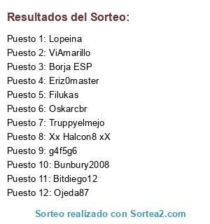 Lista de participantes: Borja ESP, Oskarcbr, Bitdiego12, g4f5g6, Ojeda87, ViAmarillo, Lopeina, Eriz0master, Filukas, Truppyelmejo, Bunbury2008, Xx Halcon8 xX.