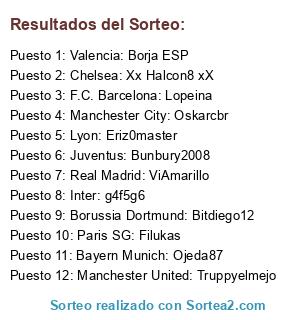 Lista de participantes: F.C. Barcelona: Lopeina, Real Madrid: ViAmarillo, Valencia: Borja ESP, Lyon: Eriz0master, Paris SG: Filukas, Manchester City: Oskarcbr, Manchester United: Truppyelmejo, Chelsea: Xx Halcon8 xX, Inter: g4f5g6, Juventus: Bunbury2008, Borussia Dortmund: Bitdiego12, Bayern Munich: Ojeda87.