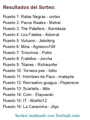 Lista de participantes: IT - Marlito12, Los Faletes - Adumat, Pavos Reales - Metral, Titanes - Richisanfer, The Paleñers - Kamikaze, Com - Elayuwoki, Fratellos - Jorcha, Mina - Agresivo100, La Canarinha - Jliyo, Recreativo guagua - Peperecre, Vulcano - Jakoking, Tricornios - Polini, Hombres de Paco - mateyita, Ratas Negras - cortex, Scarletts - tililis, Torneos pes - lolito.