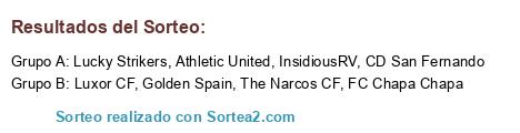 Lista de participantes: Luxor CF, Athletic United, FC Chapa Chapa, Lucky Strikers, InsidiousRV, The Narcos CF, CD San Fernando, Golden Spain.