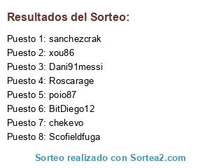Lista de participantes: Roscarage, Dani91messi, poio87, chekevo, Scofieldfuga, sanchezcrak, BitDiego12, xou86.