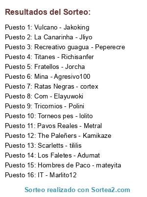Lista de participantes: IT - Marlito12, Los Faletes - Adumat, Pavos Reales - Metral, Titanes - Richisanfer, The Paleñers - Kamikaze, Com - Elayuwoki, Fratellos - Jorcha, Mina - Agresivo100, La Canarinha - Jliyo, Recreativo guagua - Peperecre, Vulcano - Jakoking, Tricornios - Polini, Hombres de Paco - mateyita, Ratas Negras - cortex, Scarletts - tililis, Torneos pes - lolito.
