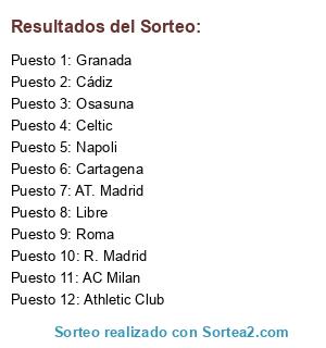 Lista de participantes: Celtic, R. Madrid, Napoli, AC Milan, Osasuna, Granada, AT. Madrid, Roma, Cádiz, Cartagena, Athletic Club, Libre.
