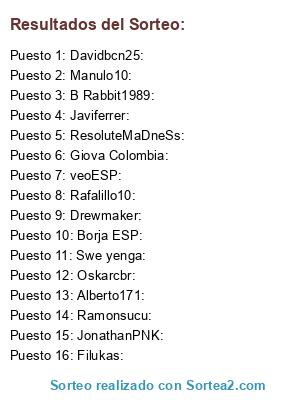 Lista de participantes: Borja ESP: , Javiferrer:, Oskarcbr: , Davidbcn25: , Drewmaker: , Rafalillo10: , Alberto171: , Swe yenga: , Filukas: , Ramonsucu: , B Rabbit1989: , Manulo10: , ResoluteMaDneSs: , JonathanPNK: , Giova Colombia: , veoESP:.