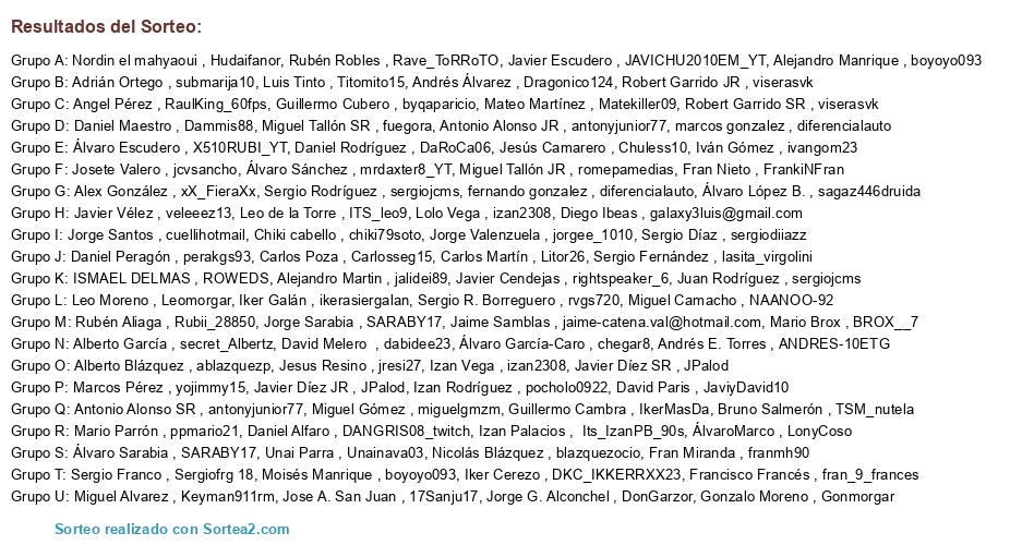 Lista de participantes: Álvaro García-Caro , chegar8, fernando gonzalez , diferencialauto, Javier Díez JR , JPalod, Javier Cendejas , rightspeaker_6, @jaime-catena.val, Andrés E. Torres , ANDRES-10ETG, Fran Miranda , franmh90, Unai Parra , Unainava03, Alex González , xX_FieraXx, Sergio Rodríguez , sergiojcms, Juan Rodríguez , sergiojcms, Daniel Maestro , Dammis88, Sergio Díaz , sergiodiiazz, Bruno Salmerón , TSM_nutela, Álvaro Escudero , X510RUBI_YT, Javier Escudero , JAVICHU2010EM_YT, David Paris , JaviyDavid10, Álvaro Sánchez , mrdaxter8_YT, Rubén Aliaga , Rubii_28850, Izan Rodríguez , pocholo0922, Daniel Rodríguez , DaRoCa06, Jose A. San Juan , 17Sanju17, Javier Vélez , veleeez13, Adrián Ortego , submarija10, Alberto García , secret_Albertz, Nordin el mahyaoui , Hudaifanor, Fran Nieto , FrankiNFran, Sergio Fernández , lasita_virgolini, Miguel Camacho , NAANOO-92, Gonzalo Moreno , Gonmorgar, Leo Moreno , Leomorgar, Luis Tinto , Titomito15, Josete Valero , jcvsancho, Alejandro Martin , jalidei89, Alberto Blázquez , ablazquezp, Nicolás Blázquez , blazquezocio, Izan Vega , izan2308, Lolo Vega , izan2308, Miguel Gómez , miguelgmzm, @galaxy3luis, Iker Cerezo , DKC_IKKERRXX23, Francisco Francés , fran_9_frances, Antonio Alonso JR , antonyjunior77, Antonio Alonso SR , antonyjunior77, Izan Palacios , Its_IzanPB_90s, Sergio Franco , Sergiofrg 18, Alejandro Manrique , boyoyo093, Moisés Manrique , boyoyo093, Jorge Valenzuela , jorgee_1010, Miguel Tallón SR , fuegora, Miguel Tallón JR , romepamedias, Iker Galán , ikerasiergalan, Carlos Martín , Litor26, ÁlvaroMarco , LonyCoso, Angel Pérez , RaulKing_60fps, Javier Díez SR , JPalod, Miguel Alvarez , Keyman911rm, Daniel Alfaro , DANGRIS08_twitch, Carlos Poza , Carlosseg15, Iván Gómez , ivangom23, Andrés Álvarez , Dragonico124, Rubén Robles , Rave_ToRRoTO, Jorge Santos , cuellihotmail, Mateo Martínez , Matekiller09, Leo de la Torre , ITS_leo9, Guillermo Cubero , byqaparicio, Mario Parrón , ppmario21, Robert Garrido JR , viserasvk, Robert Garrido SR , viserasvk, Daniel Peragón , perakgs93, Jorge G. Alconchel , DonGarzor, Mario Brox , BROX__7, Jorge Sarabia , SARABY17, Álvaro Sarabia , SARABY17, Sergio R. Borreguero , rvgs720, Álvaro López B. , sagaz446druida, Marcos Pérez , yojimmy15, Guillermo Cambra , IkerMasDa, ISMAEL DELMAS , ROWEDS, Jesus Resino , jresi27, Chiki cabello , chiki79soto, Jesús Camarero , Chuless10, David Melero , dabidee23, marcos gonzalez , diferencialauto.