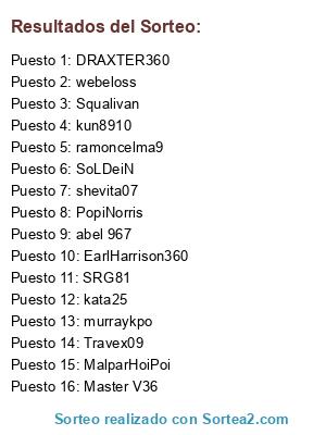 Lista de participantes: MalparHoiPoi, abel 967, DRAXTER360, kata25, EarlHarrison360, SoLDeiN, Travex09, webeloss, shevita07, SRG81, PopiNorris, ramoncelma9, kun8910, Squalivan, murraykpo, Master V36.