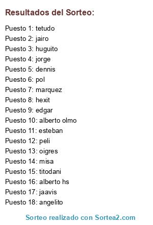 Lista de participantes: edgar, peli, alberto hs, pol, alberto olmo, esteban, titodani, tetudo, misa, dennis, oigres, marquez, huguito, jorge, jairo, jaavis, angelito, hexit.