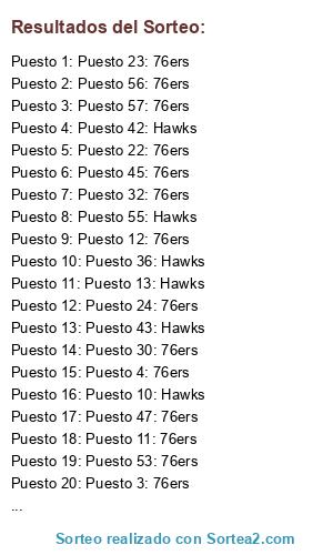 Lista de participantes: Puesto 1: Bucks, Puesto 2: Suns, Puesto 3: Bucks, Puesto 4: Bucks, Puesto 5: Suns, Puesto 6: Suns, Puesto 7: Suns, Puesto 8: Mavericks, Puesto 9: Mavericks, Puesto 10: Suns, Puesto 11: Suns, Puesto 12: Suns, Puesto 13: Suns, Puesto 14: Bucks, Puesto 15: Suns, Puesto 16: Bucks, Puesto 17: Suns, Puesto 18: Bucks, Puesto 19: Suns, Puesto 20: Mavericks, Puesto 21: Suns, Puesto 22: Bucks, Puesto 23: Suns, Puesto 24: Bucks, Puesto 25: Mavericks, Puesto 26: Mavericks, Puesto 27: Suns, Puesto 28: Bucks, Puesto 29: Suns, Puesto 30: Mavericks, Puesto 31: Bucks, Puesto 32: Suns, Puesto 33: Suns, Puesto 34: Suns, Puesto 35: Mavericks, Puesto 36: Suns, Puesto 37: Mavericks, Puesto 38: Suns, Puesto 39: Bucks, Puesto 40: Suns, Puesto 41: Bucks, Puesto 42: Bucks, Puesto 43: Mavericks, Puesto 44: Bucks, Puesto 45: Mavericks, Puesto 46: Suns, Puesto 47: Mavericks, Puesto 48: Suns, Puesto 49: Suns, Puesto 50: Bucks, Puesto 51: Suns, Puesto 52: Bucks, Puesto 53: Suns, Puesto 54: Bucks, Puesto 55: Suns, Puesto 56: Suns, Puesto 57: Bucks, Puesto 58: Bucks, Puesto 59: Suns, Puesto 60: Suns, Puesto 61: Suns, Puesto 62: Suns, Puesto 63: Suns, Puesto 64: Bucks, Puesto 65: Mavericks, Puesto 66: Mavericks, Puesto 67: Bucks.