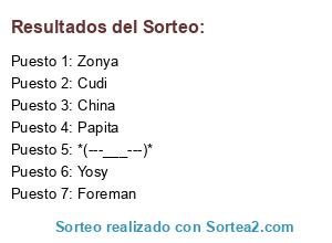 Lista de participantes: Papita, China, *(---___---)*, Zonya, Cudi, Yosy, Foreman.