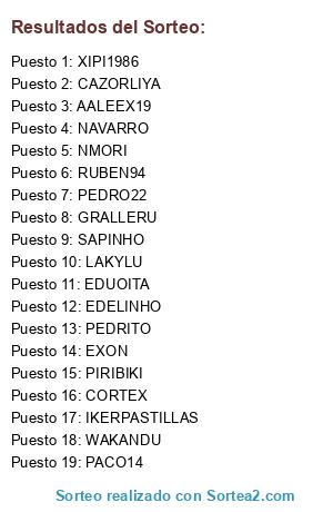 Lista de participantes: PACO14, NMORI, RUBEN94, IKERPASTILLAS, PEDRITO, GRALLERU, EXON, CORTEX, PIRIBIKI, LAKYLU, PEDRO22, NAVARRO, AALEEX19, XIPI1986, EDELINHO, SAPINHO, CAZORLIYA, WAKANDU, EDUOITA.
