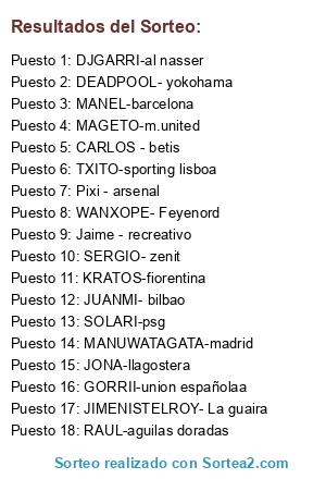 Lista de participantes: MANUWATAGATA-madrid, RAUL-aguilas doradas, JONA-llagostera, TXITO-sporting lisboa, KRATOS-fiorentina, MANEL-barcelona, MAGETO-m.united, JUANMI- bilbao, GORRII-union españolaa, DJGARRI-al nasser, WANXOPE- Feyenord, JIMENISTELROY- La guaira, DEADPOOL- yokohama, SERGIO- zenit, CARLOS - betis, SOLARI-psg, Jaime - recreativo, Pixi - arsenal.