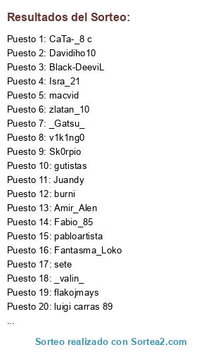Lista de participantes: mescamilla, Perdy_trs, hintoni, assalito, Juandy, osvaldiito, xXSeVi_STyLeXx, diegol, lolazo, CHiMeNiNHo, Makiki, macvid, fortopeta, vicente_el_mas, iru, Isra_21, CaTa-_8 c, luigi carras 89, _Gatsu_, maykelillo9, rafana, flakojmays, JAS_73, Sk0rpio, cortex, Sir Kaisser, moisinho, poletinho10, ruben-94_, ZeQuI, Jose_Polo, burni, frias_01, dani_cdsf, IKER-00, albert2, angelcop83, v1k1ng0, richisanfer, cipotti, deiviz81, pabloartista, RiS, Black-DeeviL, piporuiz, er_oze18, shanero, gutistas, litoo91, DomiN, cokegol, Pichixi_Neng, erkobra18, sete, jpc_89, Gores19, sugerman, francis15, ismaeljimva, Dimape90, beivi98, poyis5, _valin_, Fabio_85, gurkham, Davidiho10, el_tangao, roqueluis, jbv13, egidopau, Marlito, Raven, zlatan_10, Fantasma_Loko, harrytxu, Amir_Alen, sefirottt, Trammel7, JoOkeR, SOID.