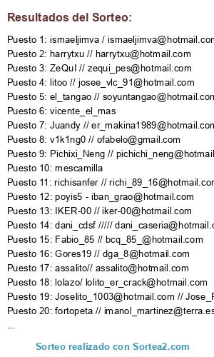 Lista de participantes: mescamilla, @Perdy_trs, @hintoni, @assalito, @er_makina1989, @osvaldito9, xXSeVi_STyLeXx, @dieguito_thebest, @lolito_er_crack, @chimeps3, @se_makiki_16, @david-olmedo, @imanol_martinez, vicente_el_mas, @navarrete_099, @israel_febrero, @cataproviciaos, luigi carras 89, @rubenyanes57, @michaelbacas, @rafana04, flakojmays, @jorgealaez, @fabro_3000, @cortex_xx, Sir Kaisser, @moisesito, @poletinho10, @ruben_bosch7, @zequi_pes, @Joselito_1003, @fernan_buco, @frias_01_liga, @dani_caseria, @iker-00, @roig.albert, @angelcop83, @ofabelo, @richi_89_16, @dj_trippy_sanfer, @daviddiaz81, @pabloartista, @richi_i, @djroybdn, @pipo_erica, @joselete11, @charly_shanero, @cielete_maria, @josee_vlc_91, @xdominx, @cokegol1984, @pichichi_neng, @marcgava, @sete781, @jesus_roney9, @dga_8, @manine_palma, @francis15pes, @ismaeljimva, @dimape23, beivi98 - beivi92hotmail.com, @iban_grao, @ruben_gv_69, @bcq_85_, @xori_12, @david.tillo, @soyuntangao, @fitipaldi_76, @jordiblay_93, @egidopau, @marlito12, @ravenn8, @sandovaliyo_87, Fantasma_Loko, @harrytxu, @amirdergic, @luis___1983, @amaro1982, @tistofer_3, @competicionespesps3.