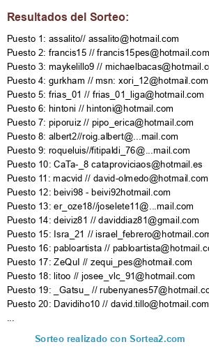 Lista de participantes: mescamilla, Perdy_trs, hintoni, assalito, Juandy, osvaldiito, xXSeVi_STyLeXx, diegol, lolazo, CHiMeNiNHo, Makiki, macvid, fortopeta, vicente_el_mas, iru, Isra_21, CaTa-_8 c, luigi carras 89, _Gatsu_, maykelillo9, rafana, flakojmays, JAS_73, Sk0rpio, cortex, Sir Kaisser, moisinho, poletinho10, ruben-94_, ZeQuI, Jose_Polo, burni, frias_01, dani_cdsf, IKER-00, albert2, angelcop83, v1k1ng0, richisanfer, cipotti, deiviz81, pabloartista, RiS, Black-DeeviL, piporuiz, er_oze18, shanero, gutistas, litoo91, DomiN, cokegol, Pichixi_Neng, erkobra18, sete, jpc_89, Gores19, sugerman, francis15, ismaeljimva, Dimape90, beivi98, poyis5, _valin_, Fabio_85, gurkham, Davidiho10, el_tangao, roqueluis, jbv13, egidopau, Marlito, Raven, zlatan_10, Fantasma_Loko, harrytxu, Amir_Alen, sefirottt, Trammel7, JoOkeR, SOID.