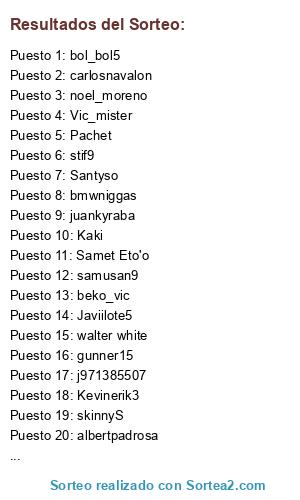 Lista de participantes: Ivairu, albertpadrosa, albgalsan, alexpitarque, beko_vic, gunner15, bmwniggas, carlosnavalon, FOXes10z, Spartacus2393, meness, j971385507, contreras, Lacalle90, Kaki, Kevinerik3, manolonti89, MM97, donCola, bol_bol5, Pachet, Samet Eto'o, Samugalego, samusan9, skinnyS, stif9, Yera980, Leobarcelona, Santyso, Vic_mister, walter white, jf_guiza, Miguel85, rgrprz, Sefis_10, Javiilote5, juankyraba, Rabadan.alex10, noel_moreno, Povedilla.