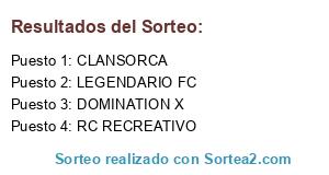 Lista de participantes: LEGENDARIO FC, DOMINATION X, CLANSORCA, RC RECREATIVO.