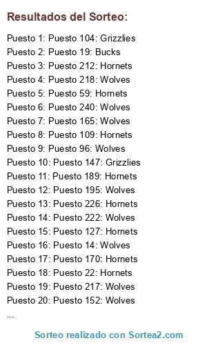 Lista de participantes: Puesto 1: Grizzlies, Puesto 2: Wolves, Puesto 3: Hornets, Puesto 4: Hornets, Puesto 5: Wolves, Puesto 6: Wolves, Puesto 7: Bucks, Puesto 8: Wolves, Puesto 9: Hornets, Puesto 10: Grizzlies, Puesto 11: Bucks, Puesto 12: Hornets, Puesto 13: Wolves, Puesto 14: Wolves, Puesto 15: Wolves, Puesto 16: Wolves, Puesto 17: Wolves, Puesto 18: Grizzlies, Puesto 19: Bucks, Puesto 20: Wolves, Puesto 21: Grizzlies, Puesto 22: Hornets, Puesto 23: Bucks, Puesto 24: Wolves, Puesto 25: Hornets, Puesto 26: Bucks, Puesto 27: Grizzlies, Puesto 28: Bucks, Puesto 29: Wolves, Puesto 30: Hornets, Puesto 31: Wolves, Puesto 32: Wolves, Puesto 33: Wolves, Puesto 34: Wolves, Puesto 35: Wolves, Puesto 36: Bucks, Puesto 37: Wolves, Puesto 38: Bucks, Puesto 39: Wolves, Puesto 40: Hornets, Puesto 41: Hornets, Puesto 42: Grizzlies, Puesto 43: Grizzlies, Puesto 44: Grizzlies, Puesto 45: Wolves, Puesto 46: Bucks, Puesto 47: Bucks, Puesto 48: Wolves, Puesto 49: Grizzlies, Puesto 50: Wolves, Puesto 51: Wolves, Puesto 52: Wolves, Puesto 53: Bucks, Puesto 54: Wolves, Puesto 55: Grizzlies, Puesto 56: Wolves, Puesto 57: Wolves, Puesto 58: Wolves, Puesto 59: Hornets, Puesto 60: Bucks, Puesto 61: Wolves, Puesto 62: Wolves, Puesto 63: Wolves, Puesto 64: Hornets, Puesto 65: Grizzlies, Puesto 66: Wolves, Puesto 67: Hornets, Puesto 68: Hornets, Puesto 69: Wolves, Puesto 70: Wolves, Puesto 71: Grizzlies, Puesto 72: Wolves, Puesto 73: Hornets, Puesto 74: Bucks, Puesto 75: Wolves, Puesto 76: Wolves, Puesto 77: Wolves, Puesto 78: Bucks, Puesto 79: Grizzlies, Puesto 80: Hornets, Puesto 81: Hornets, Puesto 82: Grizzlies, Puesto 83: Grizzlies, Puesto 84: Wolves, Puesto 85: Wolves, Puesto 86: Grizzlies, Puesto 87: Grizzlies, Puesto 88: Grizzlies, Puesto 89: Wolves, Puesto 90: Bucks, Puesto 91: Wolves, Puesto 92: Wolves, Puesto 93: Wolves, Puesto 94: Hornets, Puesto 95: Grizzlies, Puesto 96: Wolves, Puesto 97: Wolves, Puesto 98: Wolves, Puesto 99: Grizzlies, Puesto 100: Grizzlies, Puesto 101: Bucks, Puesto 102: Wolves, Puesto 103: Bucks, Puesto 104: Grizzlies, Puesto 105: Wolves, Puesto 106: Wolves, Puesto 107: Bucks, Puesto 108: Wolves, Puesto 109: Hornets, Puesto 110: Grizzlies, Puesto 111: Wolves, Puesto 112: Wolves, Puesto 113: Wolves, Puesto 114: Wolves, Puesto 115: Wolves, Puesto 116: Grizzlies, Puesto 117: Hornets, Puesto 118: Grizzlies, Puesto 119: Hornets, Puesto 120: Grizzlies, Puesto 121: Wolves, Puesto 122: Hornets, Puesto 123: Wolves, Puesto 124: Grizzlies, Puesto 125: Grizzlies, Puesto 126: Wolves, Puesto 127: Hornets, Puesto 128: Bucks, Puesto 129: Hornets, Puesto 130: Grizzlies, Puesto 131: Wolves, Puesto 132: Wolves, Puesto 133: Wolves, Puesto 134: Wolves, Puesto 135: Grizzlies, Puesto 136: Hornets, Puesto 137: Wolves, Puesto 138: Hornets, Puesto 139: Wolves, Puesto 140: Wolves, Puesto 141: Bucks, Puesto 142: Wolves, Puesto 143: Hornets, Puesto 144: Bucks, Puesto 145: Wolves, Puesto 146: Wolves, Puesto 147: Grizzlies, Puesto 148: Grizzlies, Puesto 149: Wolves, Puesto 150: Wolves, Puesto 151: Hornets, Puesto 152: Wolves, Puesto 153: Grizzlies, Puesto 154: Wolves, Puesto 155: Wolves, Puesto 156: Bucks, Puesto 157: Wolves, Puesto 158: Grizzlies, Puesto 159: Wolves, Puesto 160: Wolves, Puesto 161: Wolves, Puesto 162: Wolves, Puesto 163: Wolves, Puesto 164: Wolves, Puesto 165: Wolves, Puesto 166: Wolves, Puesto 167: Wolves, Puesto 168: Grizzlies, Puesto 169: Hornets, Puesto 170: Hornets, Puesto 171: Wolves, Puesto 172: Wolves, Puesto 173: Bucks, Puesto 174: Wolves, Puesto 175: Wolves, Puesto 176: Grizzlies, Puesto 177: Wolves, Puesto 178: Wolves, Puesto 179: Hornets, Puesto 180: Hornets, Puesto 181: Wolves, Puesto 182: Wolves, Puesto 183: Wolves, Puesto 184: Grizzlies, Puesto 185: Wolves, Puesto 186: Hornets, Puesto 187: Grizzlies, Puesto 188: Grizzlies, Puesto 189: Hornets, Puesto 190: Hornets, Puesto 191: Hornets, Puesto 192: Hornets, Puesto 193: Wolves, Puesto 194: Wolves, Puesto 195: Wolves, Puesto 196: Grizzlies, Puesto 197: Wolves, Puesto 198: Hornets, Puesto 199: Wolves, Puesto 200: Hornets, Puesto 201: Wolves, Puesto 202: Hornets, Puesto 203: Grizzlies, Puesto 204: Wolves, Puesto 205: Grizzlies, Puesto 206: Wolves, Puesto 207: Wolves, Puesto 208: Wolves, Puesto 209: Grizzlies, Puesto 210: Wolves, Puesto 211: Wolves, Puesto 212: Hornets, Puesto 213: Bucks, Puesto 214: Bucks, Puesto 215: Wolves, Puesto 216: Wolves, Puesto 217: Wolves, Puesto 218: Wolves, Puesto 219: Wolves, Puesto 220: Wolves, Puesto 221: Wolves, Puesto 222: Wolves, Puesto 223: Wolves, Puesto 224: Hornets, Puesto 225: Hornets, Puesto 226: Hornets, Puesto 227: Grizzlies, Puesto 228: Wolves, Puesto 229: Wolves, Puesto 230: Hornets, Puesto 231: Grizzlies, Puesto 232: Wolves, Puesto 233: Grizzlies, Puesto 234: Hornets, Puesto 235: Wolves, Puesto 236: Grizzlies, Puesto 237: Wolves, Puesto 238: Wolves, Puesto 239: Wolves, Puesto 240: Wolves, Puesto 241: Wolves, Puesto 242: Bucks, Puesto 243: Hornets, Puesto 244: Hornets, Puesto 245: Bucks, Puesto 246: Grizzlies, Puesto 247: Wolves, Puesto 248: Bucks, Puesto 249: Wolves, Puesto 250: Wolves, Puesto 251: Hornets, Puesto 252: Grizzlies, Puesto 253: Grizzlies, Puesto 254: Bucks, Puesto 255: Grizzlies, Puesto 256: Wolves, Puesto 257: Wolves, Puesto 258: Wolves, Puesto 259: Wolves, Puesto 260: Wolves, Puesto 261: Grizzlies, Puesto 262: Wolves, Puesto 263: Wolves, Puesto 264: Wolves, Puesto 265: Wolves.