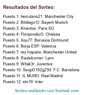 Lista de participantes: Borja ESP: Valencia, Bitdiego12: Bayern Munich, rey hispano: Manchester United, IL MURO: Real Madrid, Kinectox: Paris SG, shr19: Inter, herculano21: Manchester City, Witak3r: Juventus, SergiO19ZgZ93: F.C. Barcelona, Xou77: Borussia Dortmund, FloripondioO: Chelsea, Raulelcorner: Lyon.