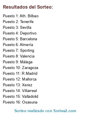 Lista de participantes: Deportivo, R.Madrid, Barcelona, Sevilla, Valencia, Ath. Bilbao, Villarreal, Tenerife, Almería, Málaga, Sporting, Osasuna, Mallorca, Xerez, Valladolid, Zaragoza.
