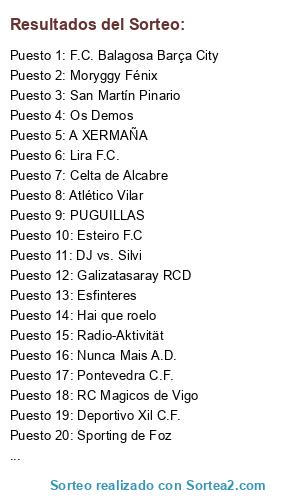 Lista de participantes: FC Estrela Vermelha, Os Demos, Lira F.C., mandinDX, CD Barco, s.d. fenomenos, PUGUILLAS, Pontevedra C.F., Galizatasaray RCD, Deportivo Xil C.F., Radio-Aktivität, Celta de Alcabre, Rápido de Pumar, Nunca Mais A.D., Taboada F.S, Esteiro F.C, DJ vs. Silvi, Deportivo Txotxe, Pedre FC, Sporting de Foz, Atlético Vilar, Hai que roelo, RC Magicos de Vigo, F.C. Balagosa Barça City, Moryggy Fénix, Area da cruz, A XERMAÑA, Imbencibles F.C, Athletic Regina, San Martín Pinario, SPORTING BERGONDO, Esfinteres.