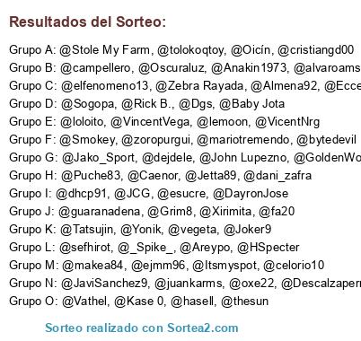 Lista de participantes: @fa20, @Jako_Sport, @bytedevil, @Grim8, @loloito, @Yonik, @Jetta89, @celorio10, @JaviSanchez9, @Baby Jota, @Vathel, @_Spike_, @makea84, @Dgs, @Tatsujin, @lemoon, @VicentNrg, @zoropurgui, @Zebra Rayada, @Oicín, @dejdele, @Areypo, @GoldenWoman, @VincentVega, @sefhirot, @Sogopa, @campellero, @juankarms, @Anakin1973, @DayronJose, @guaranadena, @Joker9, @Puche83, @John Lupezno, @Ecce, @thesun, @Oscuraluz, @tolokoqtoy, @vegeta, @hasell, @ejmm96, @Xirimita, @alvaroams, @cristiangd00, @esucre, @Almena92, @Rick B., @oxe22, @Smokey, @Kase 0, @mariotremendo, @JCG, @dani_zafra, @dhcp91, @Caenor, @Stole My Farm, @HSpecter, @Descalzaperros, @Itsmyspot, @elfenomeno13.