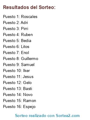 Lista de participantes: Samuel, Enol, Guillermo, Ruben, Iker, Roscales, Novo, Adri, Bedia, Espejo, Basti, Litos, Jesus, Ramon, Gelo, Pirri.