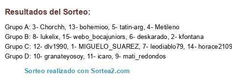 Lista de participantes: 1- MIGUELO_SUAREZ, 2- kfontana, 3- Chorchh, 4- Metileno, 5- tatin-arg, 6- deskarado, 7- leodiablo79, 8- lukelix, 9- mati_redondos, 10- granateyosoy, 11- icaro, 12- dlv1990, 13- bohemioo, 14- horace2109, 15- webo_bocajuniors.