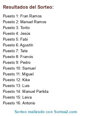 Lista de participantes: Samuel, Francis, Manuel Partida, Manuel Ramos, Luis, Fabi, Jesús, Leiva, Fran Ramos, Pedro, Tate, Torito, Kike, Miguel, Antonio, Agustín.