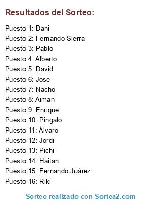 Lista de participantes: Fernando Juárez, Enrique, Aiman, Jose, Pablo, Pichi, Alberto, Álvaro, Nacho, Dani, Riki, Fernando Sierra, Jordi, Haitan, David, Pingalo.