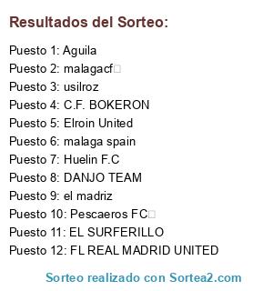 Lista de participantes: Aguila, DANJO TEAM, el madriz, EL SURFERILLO, Elroin United, FL REAL MADRID UNITED, Huelin F.C, malaga spain, malagacf , Pescaeros FC , usilroz, C.F. BOKERON.