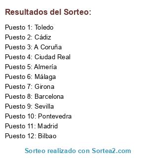 Lista de participantes: Pontevedra, Cádiz, Almería, Madrid, A Coruña, Sevilla, Ciudad Real, Bilbao, Toledo, Málaga, Girona, Barcelona.