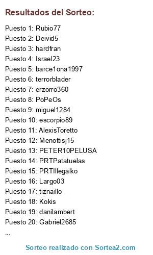 Lista de participantes: AlexisToretto, miguel1284, PoPeOs, Rubio77, danilambert, PETER10PELUSA, riverofifa, Deivid5, PRTIllegalko, Kokis, erzorro360, tiznaillo, Israel23, barce1ona1997, Gabriel2685, Menottisj15, Hodo22, PRTPatatuelas, Largo03, escorpio89, terrorblader, hardfran.