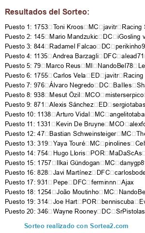 Lista de participantes: 867 Lionel Messi MP adrylito Málaga, 937 Cristiano Ronaldo EI TheForceMaker Alcorcón, 41 Manuel Neuer POR carlosbode10 Ath. Bilbao, 1035 Zlatan Ibrahimovic DC crivi Llagostera, 48 Arjen Robben MD Saavexbox Las Palmas, 305 Luis Suárez DC adrylito Málaga, 866 Andrés Iniesta MC merayombasogo Boca Juniors, 727 Eden Hazard MI tabascos89 Roma, 50 Franck Ribéry MI perikinho90 Lugo, 47 Bastian Schweinsteiger MC TheForceMaker Alcorcón, 74 Robert Lewandowski DC ggio92 Leverkusen, 414 Luka Modric MC adrylito Málaga, 415 Gareth Bale MD angelitotabasco Fiorentina, 321 David Silva MCO merayombasogo Boca Juniors, 1028 Thiago Silva DFC ferminnn Ajax, 930 Sergio Ramos DFC alemalaga94 Benfica, 323 Sergio Agüero DC perikinho90 Lugo, 45 Philip Lahm MCD TheForceMaker Alcorcón, 474 Robin Van Persie DC merayombasogo Boca Juniors, 1259 James Rodríguez MCO victub Valencia, 66 Mario Götze MCO angelitotabasco Fiorentina, 1784 Thibaut Courtois POR adriantr127 Arsenal, 604 Neymar Jr EI sergiord14 Southend United, 49 Thomas Müller MD ulimonero Juventus, 79 Marco Reus MI NandoBel78 Leganes, 43 Jerome Boateng DFC tabascos89 Roma, 936 Ángel Di María MCO ulimonero Juventus, 62 Matts Hummels DFC xSAMU Manchester United, 938 Mesut Özil MCO misterserpico Sounders, 844 Radamel Falcao DC perikinho90 Lugo, 316 Vicent Kompany DFC sergiotabascos89 Real Madrid, 346 Wayne Rooney DC SrPistolas86 Rayo Vallecano, 319 Yaya Touré MC pinolines Celtic, 864 Xavi Hernandez MC tabascos89 Roma, 337 David De Gea POR MrMohamRam Espanyol, 863 Sergio Busquets MCD crivi Llagostera, 871 Alexis Sánchez ED sergiotabascos89 Real Madrid, 1753 Toni Kroos MC javitr Racing Santander, 1138 Arturo Vidal MC angelitotabasco Fiorentina, 853 Diego Costa DC Buijin Atl. Madrid, 1185 Edinson Cavani DC victub Valencia, Juan Mata MCO, 828 Javi Martínez DFC carlosbode10 Ath. Bilbao, 754 Hugo Lloris POR MaDaScAs AC Milan, 939 Karim Benzema DC Saavexbox Las Palmas, 865 Ces Fàbregas MC benniscuba Everton, 900 Santi Cazorla MCO MrMohamRam Espanyol, 324 Carlos Tévez DC x chachiquesi x Córdoba, 244 Petr Cech POR merayombasogo Boca Juniors, 934 Xabi Alonso MCD victub Valencia, 279 Paul Pogba MC TheForceMaker Alcorcón, 1331 Kevin De Bruyne MCO alexfcbarcelona Recreativo, 584 Oscar MCO lorenbb PSG, 846 Diego Godín DFC carlosbode10 Ath. Bilbao, 944 Sami Khedira MCD angelitotabasco Fiorentina, 1795 Medhi Benatia DFC adriantr127 Arsenal, 943 Gonzalo Higuaín DC alemalaga94 Benfica, 322 Samir Nasri MI ggio92 Leverkusen, 1230 Samir Handanovic POR ferminnn Ajax, 861 Gerard Piqué DFC MrMohamRam Espanyol, 114 Klaas-Jan Huntelaar DC carlosbode10 Ath. Bilbao, 845 Arda Turan MI Yelko100 Borussia Dortmund, 1118 Wesley Sneijder MCO NandoBel78 Leganes, 1136 Giorgio Chiellini DFC perikinho90 Lugo, 1724 Daniele De Rossi MCD MrMohamRam Espanyol, 929 Iker Casillas POR sergiotabascos89 Real Madrid, 906 Isco Alarcón MCO misterserpico Sounders, 57 David Alaba LI tabascos89 Roma, 1732 Jackson Martínez DC MrMohamRam Espanyol, 1610 Nemanja Matic MCD CometHeaven79 Elche, 873 Pedro Rodríguez EI CometHeaven79 Elche, Hulk ED, 67 Kagawa MCO SrPistolas86 Rayo Vallecano, 1757 Ilkai Gündogan MC danygp89 Chelsea, 178 Fernando Muslera POR sergiord14 Southend United, 145 Mario Mandzukic DC iGosling v9 FC Barcelona, 329 Edin Dzeko DC sergiotabascos89 Real Madrid, 1217 Miralem Pjanic MC Havel7 Inter de Milan, 1641 Claudio Bravo POR KaOs I AsTuR Tottenham, 1075 Antonio Candreva ED benniscuba Everton, 1766 Claudio Marchisio MC perikinho90 Lugo, 252 Daniel Sturridge DC alemalaga94 Benfica, 1797 Blaise Matuidi MCD iGosling v9 FC Barcelona, 1277 Ezequiel Garay DFC Buijin Atl. Madrid, 1755 Carlos Vela ED javitr Racing Santander, 979 Ivan Rakitic MCO TATO XD Depor, 1796 João Miranda DFC iGosling v9 FC Barcelona, 1662 Salvatore Sirigu POR danygp89 Chelsea, 784 Stéphane Ruffier POR ulimonero Juventus, 1254 João Moutinho MC NandoBel78 Leganes, 112 Jefferson Farfán MD perikinho90 Lugo, 314 Joe Hart POR benniscuba Everton, 859 Dani Alves LD merayombasogo Boca Juniors, 976 Álvaro Negredo DC BaIIes Shakhtar Donekts, 322 Pablo Zabaleta LD Platero17 Sevilla, 870 Javier Mascherano DFC perikinho90 Lugo, 340 Nemanja Vidic DFC SSpecializeDD Manchester City, 1135 Andrea Barzagli DFC alead71 Villarreal, 931 Pepe DFC ferminnn Ajax, 897 Jeremy Toulalán MCD xSAMU Manchester United.