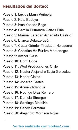 Lista de participantes: Juan Alejandro, Daniela Stronger, Alberto Varela Muñoz, Claudio Andres Fuentealba Muñoz, Brashan Fallaries Fernandez, Annie Zhdanova, Miguel Ramirez Molina, Manuel Esteban Arriagada Castillo, Hugo Felipe Cáceres Palma, Alejandro Morrison Rojas, Julio Figueroa, Joel David Djentlemen, Alan Koehler's, Loreto Pizarro Saravia, Fernando Ulloa D'alençon, Diego Oñate Pedraza, Jonathan Araya Ramirez, Blanca Delarze León, Ivan Yankee Edge, Don Dario Siri, Carlos Crowe, Camila Fernanda Cartes Piña, Nicolás Alfonso Guerrero Herrera, Constanza Ortiz, Rodrigo Díaz Romero, Rocío Pedreros Jara, Jonatán Cartes, Nestor Alejandro Tapia Gonzalez, Piero Bunbury, Juan Arbelaez, Honor Cloths, Paulo Malparido, Claudio Andrés Sepúlveda, Francisco Aweonao Culiao Gallegos, Gino Canales, Juan Führersdaughter Sanhueza, Amber Blass, Pablo Artés Urrutia, Moreno Def, Domi Edge, Angela Maria Lara, Valentina Daphne R, Armando Enrique Tapia Santos, Polito Fuentes Tapia, Zombina Piercer, Sikario Banda, Yeyo Sánchez, Wod Producciones Chile, Santiago MetalHc, Jose Antonio Reyes Barria, Sebastián Martí, Cesar Grinder Tiradeath Nolascore, Sandy Permana, Ep Alem Dos Dias Profesalid, Pato Castro, Juan David Cifuentes, Ivan Gomez Reyes, Chris Wonka, Alejandro Burgos, Christian Hc Furtivo Montenegro, Lucius Marin Peñuela, Kata Bedoya.